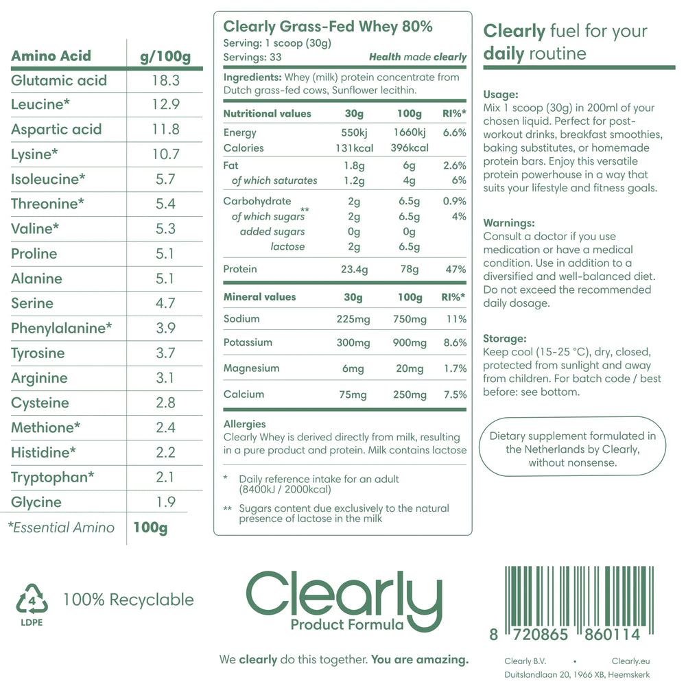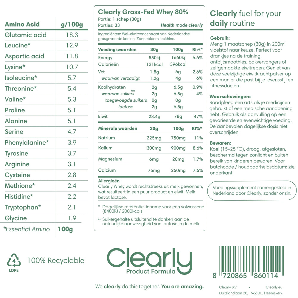 Clearly Whey is een premium, grasgevoerde whey-eiwitconcentraat, afkomstig van koeien die voornamelijk op gras grazen. Het biedt een hoogwaardige, natuurlijke bron van eiwitten met 80% eiwitgehalte, verrijkt met essentiële aminozuren en BCAA’s voor optimale spiergroei en -herstel. De overige 20% bevat lactose, gezonde vetten en essentiële mineralen, wat bijdraagt aan een compleet voedingsprofiel.