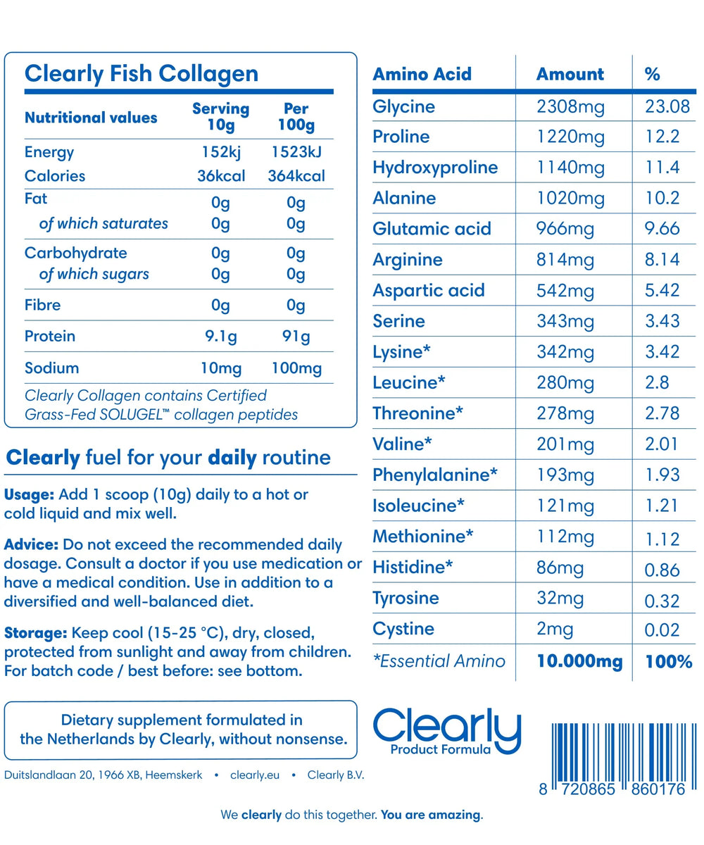 Clearly Viscollageen is een hoogwaardig viscollageen met een neutrale smaak en uitstekende biobeschikbaarheid, waardoor het snel door het lichaam wordt opgenomen. Het is rijk aan type I collageen, het meest voorkomende type in de huid, en is ideaal voor wie geen vlees eet, zoals pescotariërs. Viscollageen ondersteunt mogelijk: