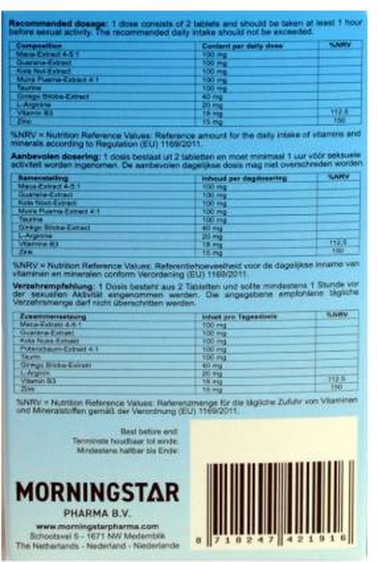 - Hoe te gebruiken: Neem 1-2 capsules in, bij voorkeur op een lege maag, voorafgaand aan seksuele activiteit.