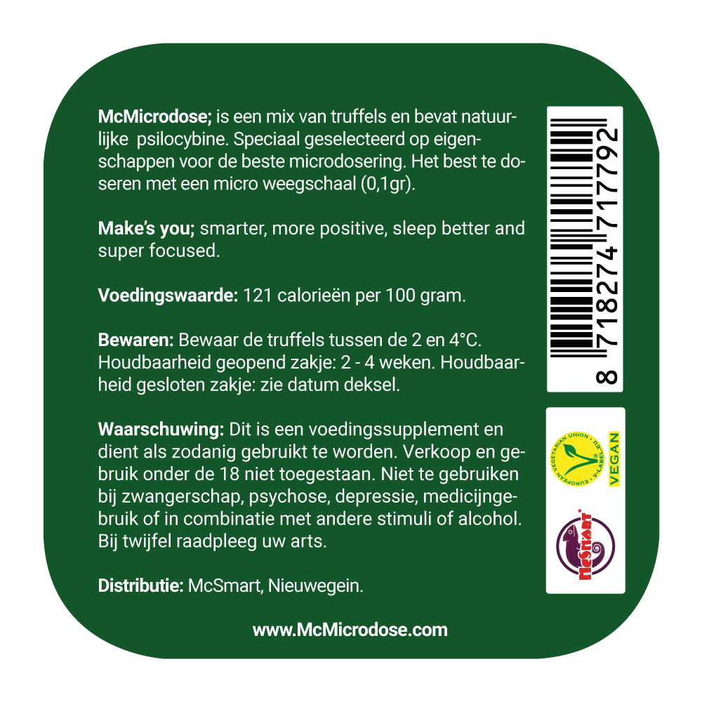 Als je op een verstandige manier beginnen met microdosering is de McMicrodose 2x5 gram ideaal. De McMicrodose is ideaal voor beginners die kennis willen maken met de pluspunten van psilocybine truffels. De verpakking bevat twee porties van 5 gram waardoor het ideaal is om eenvoudig te starten.