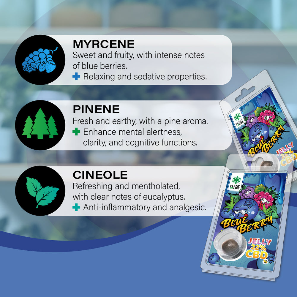 Het zoete en fruitige aroma van Jelly 22% CBD Blueberry legt de kenmerkende essentie van de Blueberry-soort vast. Hieronder staan de belangrijkste terpenen die verantwoordelijk zijn voor het aroma: