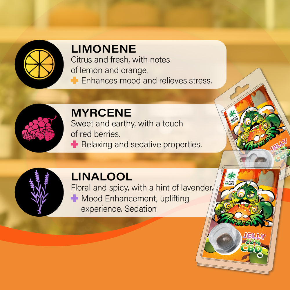 De Jelly 22% CBD Amnesia heeft een krachtig, fris en helder aroma dat perfect de essentie van de bekende Amnesia-soort weergeeft. Dit unieke profiel wordt gecreëerd door een combinatie van belangrijke terpenen: