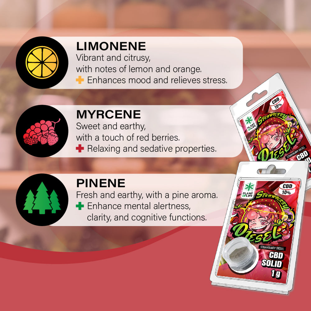 Het unieke en fruitige aroma van Solid CBD 10% Strawberry Diesel vangt de levendige essentie van de Strawberry Diesel-soort. De belangrijkste terpenen die bijdragen aan dit karakteristieke geurprofiel zijn: