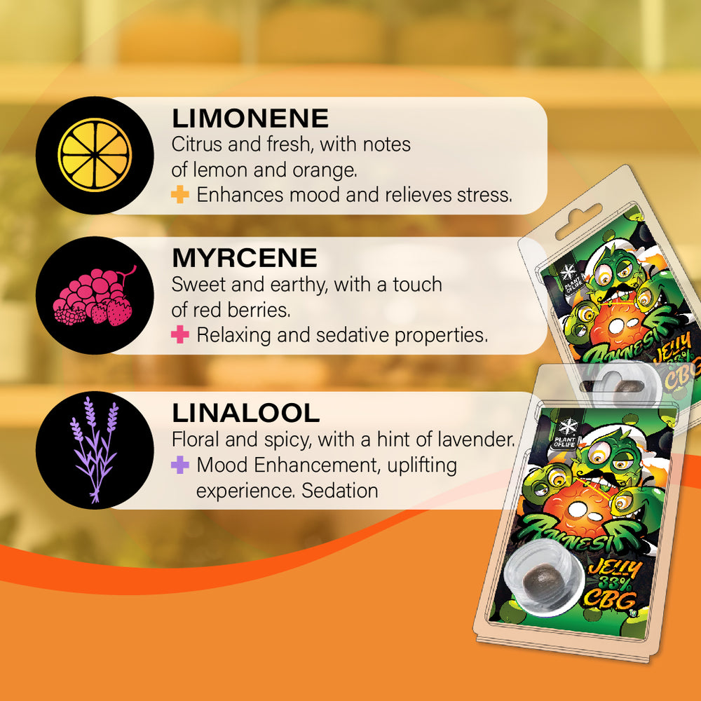 CBG Jelly Amnesia biedt een intens aromatisch profiel dat de essentie van de beroemde Amnesia-variëteit vastlegt. Het aroma wordt gekenmerkt door citrusachtige en frisse tonen van limoen en sinaasappel, afkomstig van het terpeen limoneen. Daarnaast zijn er zoete en aardse nuances aanwezig, met een vleugje rode bessen, dankzij myrceen. Tot slot voegt linalool een bloemige en kruidige dimensie toe, met een subtiele hint van lavendel.